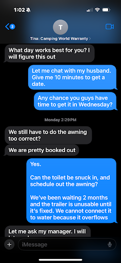 I let her know… I had already left another message for service and they didn’t call back. (I called because I didn’t hear from her) we have already missed multiple camping trips this summer. My daughter wants to go camping for her birthday… I want to use my camper.