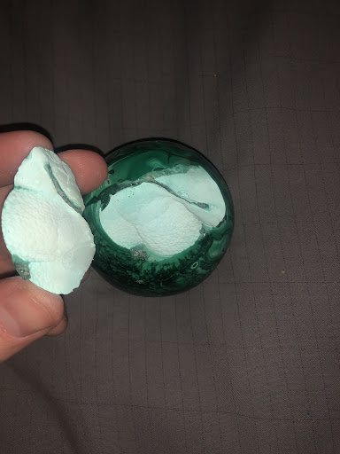 Update: after the stores Generic response, I called them to see what could be done. They assured me that this is real malachite and this just happens to be a part thatâs chrysocolla⌠go ahead everyone. Go look up pictures of chrysocolla⌠let me know when you find white powdery chrysocolla. Spoiler. You wonât. Chrysocolla is blue teal and green hues. This is fake plaster ball of some kind with a malachite like design. Itâs so Obvious itâs upsetting. A nature design would not stop at surface level. This is fake.