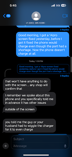 I had an iPhone 14 pro max and the screen broke , I sadly decided to come to this company hoping they could fix it . I gave them the phone on this past Friday I believe and came back they fixed the screen and it looked extremely ODD . I tried to used the phone and it started glitching and it turned pink and turned off . it just went down heel from there , we were offered a trade in with one of there devices and the "manager" was otp speaking due to the fact that he seems to never be present at his own establishment (very concerning) the tone he was speaking in was very demanding and rude! . we were told to come back the next day and we went there and they were closed down (not open) . we went up there on 2 days later which was Monday we went up there and they were now saying we needed to purchase a proximity sensor and a new screen and they would ship it to there company and had us pay a little extra for next day shipping , the part came 2 days later !! . its now Thursday they ordered it on Tuesday , I called them and they said the were waiting on me to come up there so they could get the password which doesn't make sense and sounds like a lie because they had a number that they could contact us from ( sounds like a lousy excuse ) they told me they would call back in 30 mins . I never got a call back so I called them once again because they Cleary don't know what there doing so they wait till you call and make up a excuse I called back after I was supposed to be getting a call , they then said they could ship it off to there other location and get a better look ( seems like they once again dont know what they are doing ) we spent 247 on a screen and sensor just to be told how they still couldn't fix it . they then tried to say it was doa (dead on arrival ) so why would yall allow us to pay yall if yall knew yall couldnt do anything about it . MORAL OF THE STORY do not pick this company if your looking for the best results in a phone repair . full of bull if...