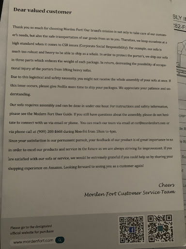 My package arrived on Friday. It is now a whole week and I am still yet to put this couch together. They shipped the couch with no legs and no screws ect to put it together. I've been calling since Saturday. They have a listed phone number but no one picks up. I have to contact them through Amazon and I get one reply per day. I have attached the conversation with them showing how they overlook my concerns and give me whatever information they feel like giving me. I have detailed exactly what I was missing and even sent a picture of what I'm missing and I still got a response which showed how careless they were towards my needs. After a week they finally decided to mail the missing part and hardware. But they didn't even care enough to do s priority shipment. Now I have to wait another week before these items arrive. Then to top it off, after all the chaos, I was contacted by Sergino Gonzale, directing me to where I could find the missing items. I advised him I check thoroughly and still did not find it. He said he would send me a picture to show where it is. I'm still waiting on that picture. He said I could call him on the number he was calling from. No answer. Bottom line, the sofa is beautiful but it's not worth the hassle. And the inconvenience of not having my space ready to host friends and family for...