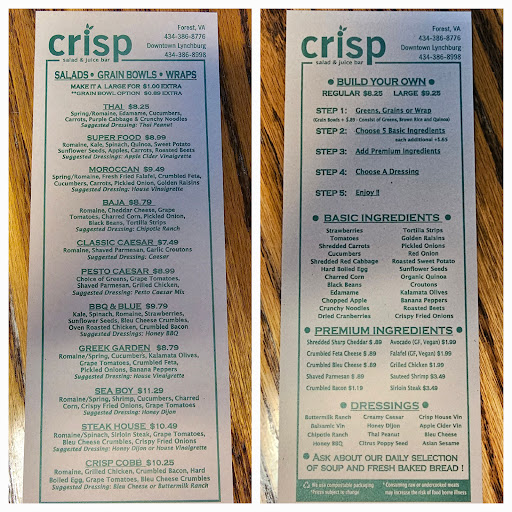 Read moreI didnât realize how much I appreciated Crisp until I tried another salad shop. I get 2-6 salads a week at Crisp (I try not to think about how much money I could be saving by making my own). I LOVE their salads, but the location isnât that convenient for me, so I tried a spot closer to where I work: they didnât even come close. Crispâs salads are consistently good, the selection of âtoppingsâ is solid and they always seem fresh, and they have a great selection of dressings. Now I will say that some of the employees seem to be less than thrilled to be there most days, but several of them are always great, and as long as they keep making me good salads, I can deal with the less-than-excited attitudes. I wonât leave you again Crisp! P.s. if youâd add black olives to the toppings options, that would...
