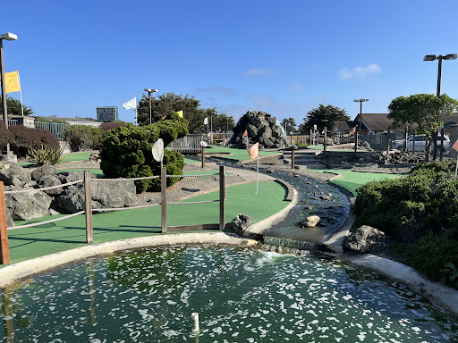 Unlike other miniature golf courses, this one has a continuous water trap running through most all of the course! In addition to that, it’s very easy to fall victim to the water since many of the holes run right up to it with no buffer to stop the ball. Another fun element of this course are the “penalty” spinners located randomly throughout the 18 holes. Sometimes a spin can help you, other times it can be detrimental to your game. The course takes around 30-45 minutes to play through dependent upon how busy it is.