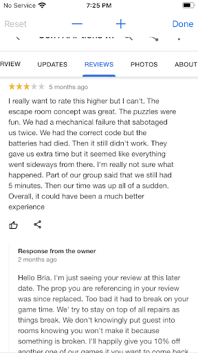 As noted, I entered into the experience on good faith and upon looking at reviews, I noticed another group had a similar experience to ours about 5 months ago, and the business offered a delayed response 3 months after that review with a bandaid discount on a future game.