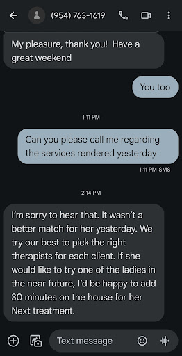 I strongly recommend others look elsewhere for their massage needs, as professionalism, hygiene, and customer care clearly arenât priorities at...