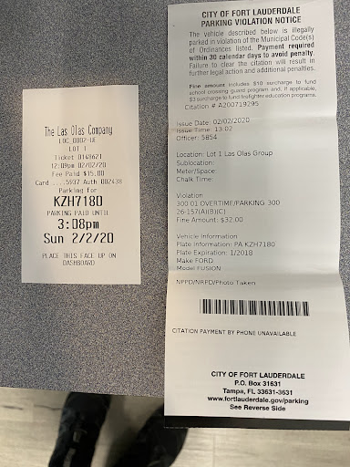 Do NOT make the logical assumption that entering your license plate number into the parking machine prevents a parking ticket because itâsâ in the systemâ. It doesnât. Only leaving it on your dashboard does. Apparently the city enforces parking on public and private lots like âlas Olas Companyâ parking lot. Itâs NOT at all easy to tell the difference for a tourist. The private lot machines according to the enforcement official we met upon returning to our car and another I called from the number on my violation do NOT communicate with the city system who enforces the parking!!!