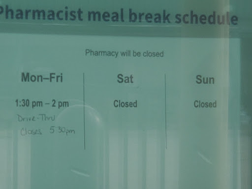 Just like many other people on Google are saying, imperfect pharmacy. It is very difficult to get a singular, clear picture of their hours. If they need a time changed, they write it in pen. They can't even figure out how to put up a new schedule for their store, it looks pretty unprofessional. This is mostly a reflection of their priorities, their break times are the largest thing displayed and it's on the...