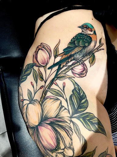 Where do I even begin?! I walked into this amazing studio without knowing what I truly wanted. All I knew is that I had this gosh awful tattoo on my thigh that I wanted covered up for years. I saw a sign in front of this business that said someone along the lines of “Don’t let a bad tattoo scare you away, come in a get it covered up”. That immediately drew me in! I first told Goldo (owner/artist) that I wanted weeping willow tree and when he saw my tattoo he said “No”. He want on to explain why, the type of tattoo that I needed covered needed more details and lines. I had always wanted an owl, so when I mentioned that - that’s when he started asking me about me. I started telling him a little more about my likes and that’s when we scheduled for a few days later.