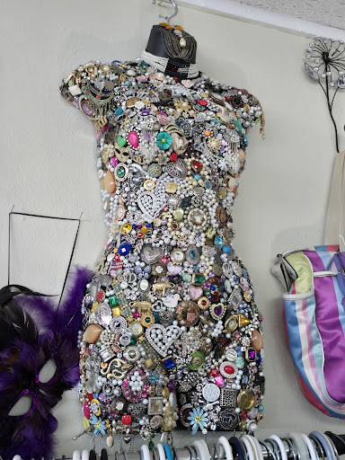 Super nice owner with unique artistic style made her now downsized and relocated store seem like a museum, displaying her talented work from the ceiling and high walls. The store had a thoughtful selection of items that would appeal to wide variety of interests. The photos shared are her personal works including 2 3/4 black velvet mannequins covered in costume jewelry including brooches that belonged to her Grandmother, and a fanciful piece of driftwood with mini lights. The aqua bikini top covered in shells Teri didn't make, but it brought images of Doris Day in the movie The Glass Bottom Boat.🐬 I bought 2 mint items a unusual early glass, souvenir dish of Disney, and a sunflower shaped, painted iron picture frame.🌻NOTE the new location on Beal Parkway and store hours. It was great...