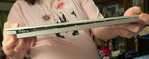 Since getting it back: When powered on, the computer had to be shut down and restarted back from safe mode (hard to say if this is a Techy issue, but it hadn’t happened with this computer before this point) The bottom of the screen casing pops open regularly The casing across the hinge on the bottom half of the laptop is flat and settled on one side and stuck up about a quarter’s thickness on the left The back side of the casing across the back of the hinge falls open regularly, and tonight, officially won’t go back in place