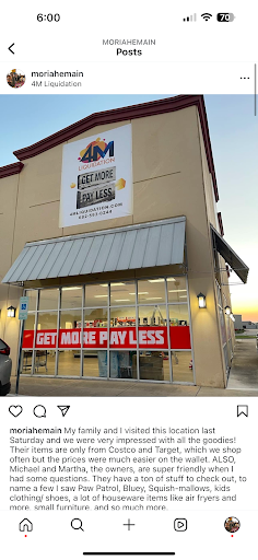 Read moreMy family and I visited this location last Saturday and we were very impressed with all the goodies! Their items are only from Costco and Target, which we shop often but the prices were much easier on the wallet. ALSO, Michael and Martha, the owners, are super friendly when I had some questions. They have a ton of stuff to check out, to name a few I saw Paw Patrol, Bluey, Squish-mallows, kids clothing/ shoes, a lot of houseware items like air fryers and more, small furniture, and so much more. If you're looking for a gift, a fun adventure, a good deal or some nice people you can find them at 4M Liquidation. We will definitely...