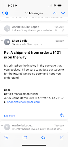 Read moreOrdered a pair of expensive earrings and when I relieved them one of the earrings was broken. I sent two emails with photos asking for support or what my options were, how I could go about returning the item, as I hadn’t even worn them. They never responded to either email. I emailed a third time to express disappointment and no one responded to that either. It’s just downright rude and such incredibly poor customer service. A little bit of tact...