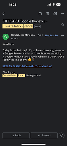 I have been living at Constellation Ranch apartments since 2020 and am immensely disappointed in the new management. The lack of communication between management and staff is evident. No one ever seems to be on the same page and there is little to no compassion for residents. I've had so many issues since the transition to new management. These are just the big ones: Issue #1 - new parking/towing policy is a SCAM! Our vehicles have been booted TWICE. One of which was clearly registered, but I forgot to change my plates over on the account when they came in the mail. Tried to dispute the boot/charge and the towing company wouldn't release it. And the apartment complex won't do anything to help. The Constellation Ranch staff I spoke with said this keeps happening and she doesn't agree with it and would talk to management but nothing has been done. We already pay thousands in rent and fees each month, it's terrible to take advantage of residents like this. Issue #2 - We moved from a 3rd floor unit to a 1st floor unit and the transition was a disaster. It took months to get a confirmed move-in date and when we finally made it into our new unit there were several issues. There was black mold in the master shower. The hardwood floor we had been promised was not put in - so we are stuck with carpet. BUT the worst of all was we had a roach infestation. I was told by an staff member the apartment next door had been left vacant and was in terrible condition - he disclosed that there was food and pet feces everywhere - and apparently they couldn't clean it because of some legal dispute with the previous resident. When I told management about the roaches, they acted shocked and told me they had been treating the building regularly. I talked to my neighbors (who also complained about roaches) who said management again, acted shocked, completely denying our claim. We paid for pet boarding and bombed our apartment and set roach bait out in every room - it didn't work. I contacted the front office again and they sent pest control out. The guy just put out more bait. Despite paying monthly fees for pest control, we didn't bother calling again since we knew they would just but more bait down and we had already done that. We had roaches the first three months in this unit until they FINALLY started gutting that abandoned unit next door. Issue #3 - contractors were hired to replace the flooring in the unit above us and they worked until 2am. I went up and knocked to complain and called the front office and left a message. No one ever responded or acknowledged this. This went on for three days. I have a child and was pregnant at the time. Very frustrating.