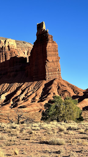 Chimney Rock is a very noticeable landmark, which looks exactly like a chimney. It looks like it is right there, but it’s not. The climb was described as: ‘The Chimney Rock Trail is perhaps the best short path, (3.5 miles RT), in the national park, as it is relatively short, not too steep, provides the shortest hike to a high elevation viewpoint. Elevation change is 580 feet. What I liked the best was the evenly spaced strata, carved as if each layer had been carefully measured for evenness in height and width and separation from the others. We were glad to read the description before starting the trail, as the climb would have been beyond our abilities. For size comparison, notice the full-sized white car in the extreme bottom left of the first photo. This landmark is just outside the entrance to Capital Reef...