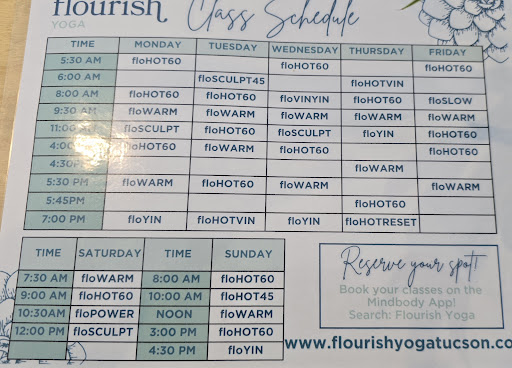Read moreThis one of the best studios in town. I have been practicing for over 10 years, and have attend every studio in the Tucson area. The space is clean and well thought out. The lobby is beautiful and has high quality merchandise. There are 3 showers fully stocked just bring a towel. For practice space is a large mirrored room with good level flooring. Which I consider an essential staple that is often looked over in a lot of studios. They have a good variety of instructors and all have different styles. Things I wish the studio had were more heated power flow classes. Majority of the classes offered are set sequence bikram style. Although, that is a great style to offer, flow classes provide a better variety of postures and better display individual instructors talents. That said I think this is an excellent studio, with good staff, amenities, and pricing. I personally have made Flourish my home base for...