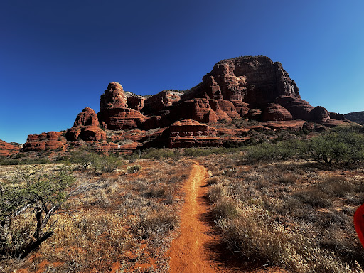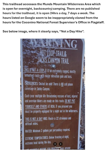 Penetrating deep into Munds Mtn. Wilderness, if you're looking for backcountry when visiting Sedona this is the place to go. From the trailhead you have two options: 1. east into Jack's Canyon 2. southwest toward Woods Canyon. If visiting Jack's Canyon, the trail passes alongside a residential area for just over a mile and then enters the canyon proper. The views aren't amazing (for Sedona) partly because the trail travels below an elevated bench and then enters a wooded creek bed and both of these obstruct views of the area . If you do follow Jacks Canyon to the top, you'll reach a saddle that connects Munds Mtn. to the Schnebly Hill area. I suggest heading up to the top of Munds Mtn for some of the best views to be had in the entire Sedona area. This is a great 2-3 day backpacking trip. From the saddle you could also head southeast and head back toward Woods Canyon which brings us back to option #2 at the trailhead. From Jack's Canyon TH, travel southwest toward Woods Canyon and you'll soon meet up with a trail that heads east and to the top of Horse Mesa - this route combined with the Jacks Canyon is whats known as The Hot Loop. I believe it's about 20 miles long, it's extremely remote, and should not be attempted in its entirety excluding extremely experienced, physically capable backcountry hikers with moderate route finding abilities - this is no man's land. Water is scarce and your 2-3 times more likely to find that then help, should you require it. Horse Mesa is long, fairly flat, and hard walking due to the softball-to-volleyball size lava rock found in and along the trail. If it's recently rained or during a snowmelt, traveling across Horse Mesa is physically draining due the thick and slippery mud that you cannot keep from weighing down your boots - expect travel times to double or triple. Toward the back of the Mesa you'll begin hiking along the run of Woods Canyon, this country is spectacular and shouldn't be missed. The views into and of Woods Canyon are unmatched in Sedona. Wildlife is plentiful and one can often see deer, elk, coyotes, numerous birds, rabbits, javelina, bats, and if you're lucky a bobcat or ring-tailed cat. Toward the back of the Mesa you may have to do some route finding as the trail back there is not often traveled and is some what overgrown. However, this only ads to the already present feelings of true wilderness adventure. Soon the trail begins to climb the canyon wall toward the Mogollon Rim and here you'll battle your way through very thick oak brush - be prepared with durable long-sleeved shirts & pants and a pair of gloves. Bonus: When you begin gaining elevation, keep your eyes open for cribbing (stacked stones and logs) in the trail built by turn-of-the-century cowboys. Upon reaching the top, the trail head northwest toward the top of Jack's Canyon and from there you can summit Munds Mtn., descend Jack's Canyon, or continue toward Schnebly Hill. The Hot Loop is an amazing backcountry opportunity and it's my personal favorite for backpacking in the Sedona area. Should you decide to do the loop, make sure to camp out on top of Munds Mtn for at least one night. Stay near the end of the trail and as close to the western rim as you can. As you watch the sun set from camp you'll then be able to watch Sedona come alive at night. If you want more info...