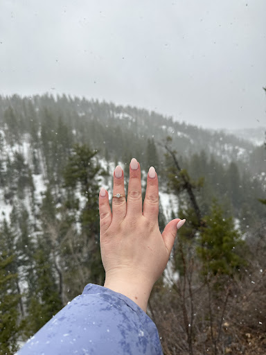 My, now, fiancé did a surprise proposal at Fish Creek Falls on a quick anniversary trip. He used a family heirloom that was many sizes too small that also needed the prongs fixed.