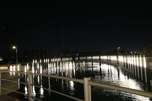 There is a huge parking lot behind the memorial with plenty of accessible parking, and there is an accessible paved sidewalk that takes you through the memorial. At the entrance, there are some engraved signs and stones, and taller engravings as well that you can read. From there, if you continue right, you'll see the row of posts which at night light up to form the ship (which you can't see unless you are at some higher point to aerially view it). After that, you reach the water area- and it seems to be more so a small lake than a river. Inside there are more posts that can light up at night. A flag proudly flies at the dock further down and you can look out into the lake.