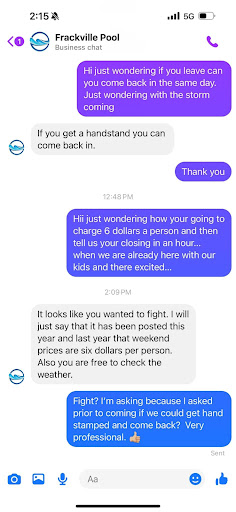 My family and I have supported the pool since day 1. Living in Frackville itself. 3 blocks away. Countless days spent there and being the first ones on a Friday afternoon. We watched countless kids, large ones intact push, throw, wrestle and toss people around. 3 or 4 people at a time down the slide. My kids enjoyed the slide and diving board for 2-3 hours until a large kid was almost thrown on-top of my 3 year old. I said something to the lifeguards, what did they do? They bared my kids from the slide and diving board and any deep part WITH an adult. Yet, I continued to watch kids throw, wrestle, do more unsafe acts and all we were told was to watch our kids and they will talk to the bigger kids or...