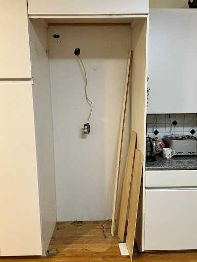 They all waited patiently as I did this, and Dorian even leaned the washer against himself to raise it so I could wipe underneath; that could not have been easy. (Fortunately, the dryer was still in the hallway and they could lay it on its side.). This all took quite some time, and Dorian spent half of it stuck behind the washer in the closet, without complaint!