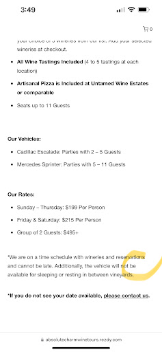 On Monday, after calling the office, I reached out to the owner directly. She pushed my call straight to voicemail & communicated only via text even though I asked her to please call me at her earliest convenience. Her office manager then called & offered a gift card to use within 1 year or to refund 50% of my almost $900 bill. I shared this was unacceptable given the misleading information on the web describing the tour, false statements provided by her team & lack of response when I tried reaching out prior to our tour - my request for a full refund was not unreasonable (additionally, we are hours away and not able to easily rebook a weekend getaway). The owner then stated this was the busiest time of yr & that our tour spot would have been booked by another had we not booked the slot, she accused me of bullying and bombarding her as I tried to share & discuss our experience & stated that I “agreed to the cancellation policy.” I did agree BASED ON the tour described on the website that I was booking. BUT advertising misleading & fraudulent info & delivering a completely different quality of service refutes it. Further, no profit was lost - the other tour continued and wineries confirmed no payment...
