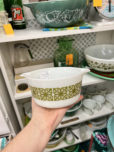 Some of my favorite booths were one with an amazing array of vintage Pyrex and other colorful mid century kitchen items and one hiding in the back with a fun (and pretty fairly priced) display of antique “Vaseline” or uranium glass!