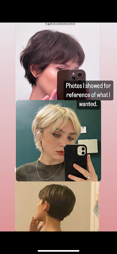 I asked her to take the length off the back of my hair but she kept it long for some reason, even after I asked her to cut it shorter. I wanted my hair cleaned up and tapered in a bit around my neck, like in the reference photos.
