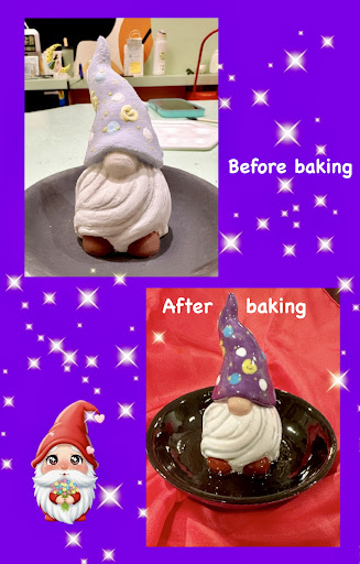 This was my first time painting a ceramic statue. I had a clear vision of what I wanted, and it took a while for the gnome ring tray to come in. I visited the studio frequently, as the employees took notice of my frequent visits and stated they would get the gnome ring tray again and to keep checking. When it finally came in, I purchased it because my husband could not find a piece that he wanted to paint that day. As we drew closer to Halloween, he finally found something to paint.
