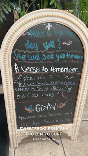 The Sweet Frog in Friendswood, Texas is hands down the BEST location Iâve ever visitedâand Iâve been to several! From the moment you walk in, youâre greeted by a warm, inviting atmosphere thatâs not just about frozen yogurt⌠itâs about faith, fun, and family.