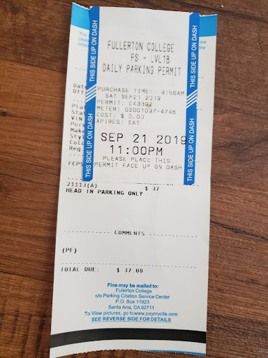 Read moreDumbest parking violation ever!!! It was literally the first day of school and parking permits weren't even being enforced; yet, they gave me a ticket. For what do you ask? They gave me a ticket because I parked head out!!! For some stupid reason they will ticket you if the head of your car is not facing the middle. I was between the lines, perfectly parked, except my car faced outward instead of inward. I didn't even reverse to park head out. I was simply there early so I drove through one parking space and parked in the next. The kicker to all of this is that I thought school might be lenient since it's the first day of class so I appealed it but nope. The younger parking assistant lady behind the glass is also rude. You will know which one I'm talking about as soon as you start speaking to them. She repeats things as if your stupid and talks to you like you are 10 years old. Thanks officer Ricky Songu for nothing. Seriously a "warning" would have sufficed. Welcome to Fullerton College day 1,...