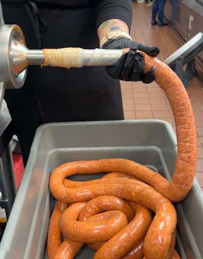Butcher offers free samples of carnitas and salsa while you wait to get your weekend BBQ on.