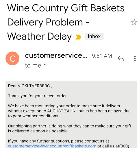 When I called first thing the morning, I was promptly informed that my gift baskets had already been shipped out without the appropriate gift message changes made. All I was offered in compensation for this mistake on the part of Wine Country was a 10% credit back on my order.