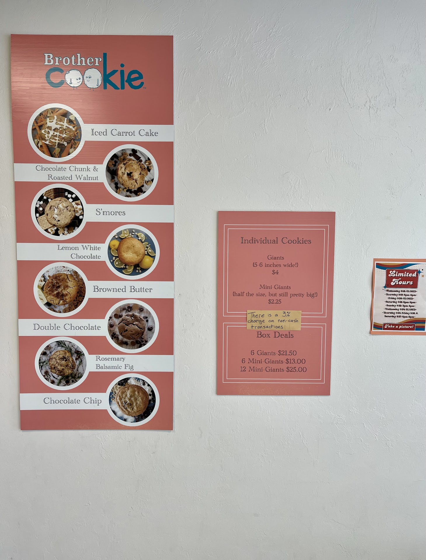 Read moreI was really excited to try this place, and I'm really happy I did. The prices are very affordable compared to their competitors, and they even have a day-old cookie special if you don't mind a little less freshness, which I think is really cool and honest. I got the Cookies and Cream giant cookie and a mini chocolate walnut cookie. They were both great! The cookies had a perfect balance of sweetness and saltiness, with a crispy crust on the outside while maintaining a gooey interior. I will say, for my preference, they were a bit undercooked, but not too much, and I really love that you can ask them to warm it up beforehand. The guy working there wasn't very vocal or cheerful, but other than that, the service was great....