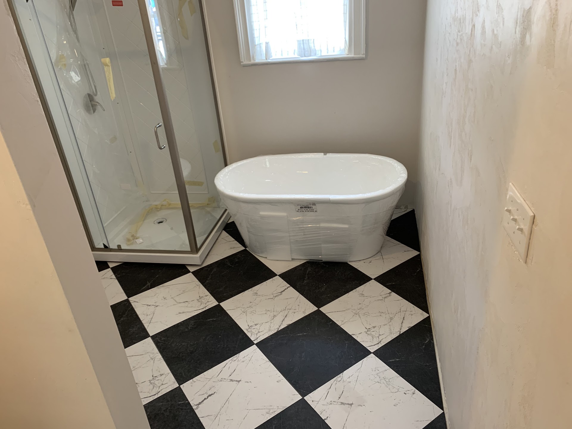 We landed at Floor & Decor, which is kinda of ironic because there was a banner towing plane at my job that flew the banner to promote the Williamsburg location. We fell in love with a black-and-white checkerboard tile—because nothing says “classy coastal chaos” like a retro floor turned 45° for extra flair. Being first-timers, we bought more than we thought we needed. Naturally, we used all of it and still came up short one box.
