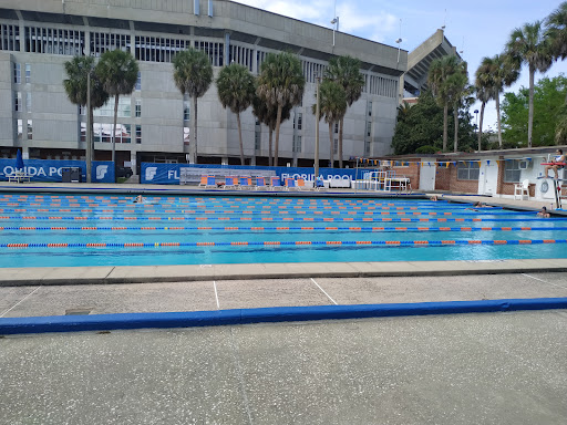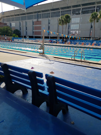 I believe you must have a Gator ID and membership to swim here. This is the site of the original pool that dates back to 1929. Back then, Olympic long course pools were 50m, but someone in Gainesville may have only had a yard stick when it was built. I wasn't there. This pool is 50yds and so is considered to me to be "long course-light." Since the original construction, the pool has been refurbished. It's a great pool to swim in. 8 wide lanes provide plenty of space. The pool depth at the shallow end is sufficiently deep. There are two, LARGE digital clocks to motivate or discourage you depending on you conditioning. During there summer, there are two powerful spraying jets to cool the pool water. There are two bathrooms with a shower each I believe. Expert level advice: Don't swim in 5 to the right of the life guard stand at the shallow end. The water circulating jets on the floor of the pool are aligned right down the middle of this lane and push water straight up. Another odd characteristic of the pool is that the wall at the shallow end seems to slope away, closer to you at the top then the bottom. The pool could use a little more vacuuming, but it's not obnoxious. The water fountain allows you to fill easily a 24 oz water bottle, though it could be updated. No lockers to store your personal items, but I have never had an issue there. They have swim gear available, kickboards and pull buoys. If you bring the guards Starbucks, then you'll be their new best friend and they'll save you first. They suffer from unnui, so that should perk them up. It's never loud or obnoxious there, so far. Swimmers of all levels including Gator Swimming Team once in a while staying loose. Bring sun screen. There's no shade over this pool. That's Ben Hill Griffin stadium in the background. The pool is closed on event days. Hours are a little...