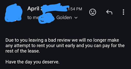 Ā Ā Ā Read moreI rented a house from golden rule for 1 year, and it was miserable. They lie about coming and fixing things. When we moved in, they claimed they sent someone in to clean, but when we got there, it was very much still dirty and gross. We begged them to let us in a day early so that we could clean before moving in. The first night we were in we had an issue with the plumbing, (we wouldnt have an issue if they properly took care of the property when no one lived in it) they did come and fix that but only because it was considered an emergency. There was an issue of bubbling with the terrible fake tiles that are in the .5 bath, and they said they would have someone come look at it. No one ever showed up. We were unable to use our front door because the stupid code locks they have on this house won't work. When we submitted a repair request for that it sat unanswered for a while and then randomly one day they marked it as a completed repair, yet the front door is still unable to be unlocked from the outside.We submitted a repair request for a cracked window we found while taking off the window film the previous person had up. They haven't sent anyone to even take a look at the window. They were 2 months late on the 6 month inspection. (was told they would send someone out to look at the bathroom tile, Shocker no one showed up, again.) I was told the autopay feature on their app works but when i signed up for it first time there was an issue and they charged me late fees. Of course, they blamed me for the autopay situation. These cowards hid in their offices and wouldn't answer the phone or door, DURING BUSINESS HOURS, After i had informed them i was coming to sort out these late fees. After sitting outside and knocking for an HOUR and having called about 14-15 times, i unfortunately gave up and just paid the fees.On top of all that, they still wanted to raise our rent for the next lease. In November the shower drain collapsed so the water wouldnt drain, and she provides a plumber he shows up and tells us its the drain and that it had collapsed because in trying to clear it he was pulling up dirt from under the house. We ask april to end our lease early so that they can just get to work and fix it without us in the way, and she can just keep our security deposit. She says no and that we "confirmed" that the tub drains just slow. When in reality, what we said was that it was draining slowly when we first moved in, and now it's not draining at all. They have since fixed the drain,(making the tub absolutely disgusting in the process and ive scrubbed it and showered and its is still nasty)Please avoid golden rule at all costs they want to charge outrageous rent for something being held together with Elmer's glue. and April, i know you will read this. can't believe how rude and unprofessional you are. You run a business act like it, not a teenager throwing out insults (saying someone has one or more severe mental illnesses)to every 1 star review you get(Which all seem to be legitimate concerns and complaints about you). Maybe April, you should take that stick out and go look at yourself in the mirror. Our house had potential, too bad companies like this one,...