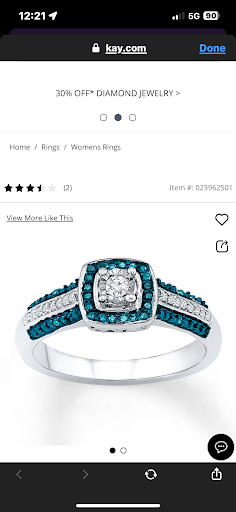 Read moreI dealt with two different Kays who never got my ring right. We purchased this ring in July and I've only had it two weeks due to it constantly being in repair and not being taken care of by the employees. I went to see Emily in Gainesville and she verified that my ring was in fact blue diamond when I was told that there were only 4. Emily verified the real diamond and talked to customer care and said that the other stores were wrong and that I did actually have the blue diamonds I paid for. She was very helpful and I will continue to shop at the gainesville location because they ACTUALLY know what they are...