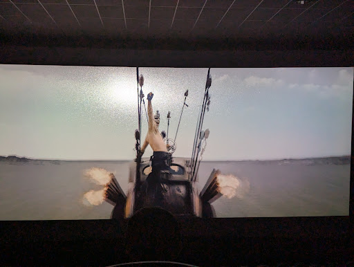 Lights were on during movie showing. Seats were sticky and uncomfortable.