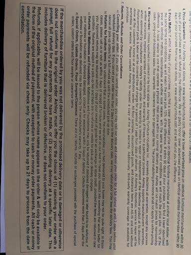 This has been the worst experience I’ve ever had with any store. They are refusing to refund me based on the terms of their fine print and have told me that its not written but a part of their process. I ordered furniture 8/16/25. I was pushed by the salesperson to order furniture I did not want. 9/8/25 I was able to cancel that furniture. I was informed that because I paid cash. I would have to wait 21 days to receive a check in the mail. It is 10/23/25 and still nothing. On 09/11/25 I finally receive the furniture that I truly wanted. Only for it to be wrong because the salesperson was in such a hurry to make the sale that he ordered the wrong color. I had to reject the wrong furniture and was advised by the delivery person to go to the store and ask them to replace the order because they would continue to send me the wrong furniture otherwise(seems like he knew how incompetent Ashley’s furniture is). I had to make a 3rd trip to the store to get this handled. To which they inform me I’d have to wait another 3-4 weeks. Upsettingly I agreed. Once 3 weeks passed and I had not heard anything I started calling to check. “ Oh we’re waiting on another piece because we can only do one delivery “ meanwhile I’ve been sleeping on the floor for over 2 months waiting. Finally they say. We’re waiting for your dresser to be delivered 10/11/25 everything else is ready. 10/15/25 I call. “We got the bedrails but we had to reorder the dresser” THEY ALREADY HAD IT IN STOCK. Now they were telling me it was going to be another 2 weeks before it arrived because they circulated inventory. I most importantly needed a bed so I asked for the bed to be delivered otherwise they would probably no longer had it in 2 weeks when the dresser arrived. They were declining to do so until I called for 3 days straight requesting it over and over again. Until they finally agreed only to tell me Id have to wait another week for it. At this point I had enough. I paid $2500 cash. I went to the store 10/15/25 and cancelled the whole order. Now they are telling me that I can not receive a refund for the cancellation on 9/8/25 until the already paid invoice was closed on 10/15/25 and I have to wait 21 days from 10/15/25 to receive a refund. Amazon delivered a bed for $300 in 2 days and beautiful and sturdy. Got a dresser from Ikea and all good! Don’t waste your money here! At this point I don’t know if Ill ever see my $2500. Oh! Because the store manager said there was no one she could call to check on my check status. I’ve been emailing back and forth with someone who says “they” just got back to me. Somethings wrong with...