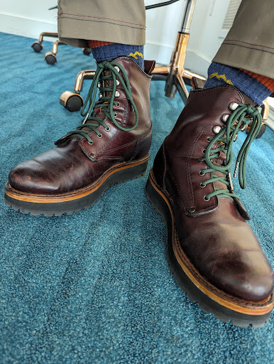 the work you see here was a "custom" resole, with a crepe mid-outsole and vibram lugged outsole. this type of modification has become somewhat popular in the heritage boot community, giving the lightweight cushion of christy soles, but the hard-wearing, grippy features of a lug outsole.