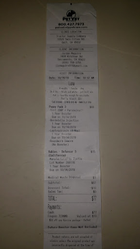Visited this store on Sunday which is when they have a Mobile PetVet Clinic come through where they give people a chance to get your puppy or dogs any of their needed sets of shots or boosters. I brought my puppy here that I had just gotten a few weeks before. I have also taken my adult Dog here when he was a puppy which is how I knew about them. Once you are finished which is typically within 15 minutes or so of them opening if you get there quick enough. The price of the sets of vaccinations they give range depending on what you need for your pet but they seem fair to me and you receive a Proof of Vaccination on site as you pay for what was given. They also give you coupons for the Tractor Supply store which includes a coupon for a free 4lb bag of one of their grain food dog foods which is named 4health and you can choose from a different variety of the formulas they carry at the store which usually comes out to be about a $10 value. Be warned that the coupons do expire that day though so take advantage of them while you are already...
