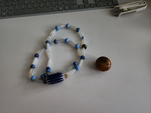 I didn't think to take a photo of the bicones before stringing them with some others from my collection, but the phenolic resin bead is still sitting in my collection, waiting for...
