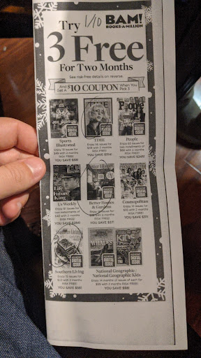 Ā Ā Ā Read moreI got here only because they are the only physical book store in my area and I have family that likes to read, so I get them gift cards. Their employees are nice BUT they always harass you to donate to all these different charities(I do donate on my own but don't like being pressured to do it in front of strangers nor like the guilt that comes with not being able to do it at the time) not only that but they pressure you to sign up for "free" magazines and pay for their discount card. People wonder why brick and mortar stores are being closed and books a million is a perfect example of why, harassing your customers to spend more than they had intended and guilting them is bad practice for a business...