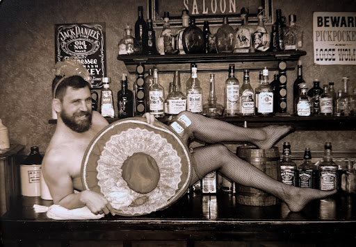 Tracy had the perfect setup ready when we arrived, and oh boy, did they go all out. They stripped Mitch down and slipped him into fishnet stockings that left nothing to the imagination, handing him a giant blue bonnet with lace and feathers to âcoverâ his⌠well, letâs just say it barely did the job! Then Becky, with a devilish grin, made him climb up on the bar in front of a cheering crowd, striking poses with just that frilly hat to shield his dignityâor what was left of it. The bar, lined with whiskey bottles, only added to the absurdity as Mitch tried to balance while everyone laughed. Becky couldnât stop giggling, saying he was a good sport but looked way too comfortable in those fishnetsâlike heâd been practicing in front of a mirror at home! They even whispered that he seemed to enjoy the spotlight a bit too much, strutting like a peacock whoâd finally found his true calling in those scandalous stockings!