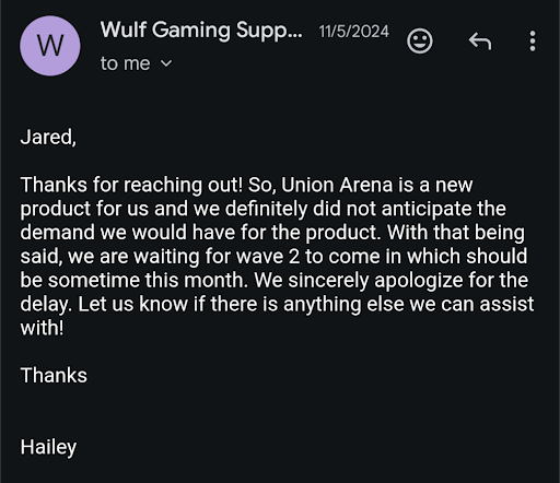 Edit 6/9/25: Reducing my review to 1-star, after a second completely unacceptable response from the Company for the other pre-order I had. Company listed the new One Piece Starter Decks for pre-order in December for MSRP ($12). Starter decks released on Friday 6/6 officially, and I was provided no update regarding my order, so I sent another email to them.