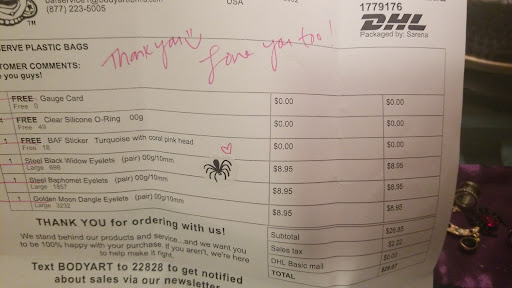 Read moreAwesome website that sells a really great variety of body jewelry. Definitely look at product reviews when considering jewelry to buy! Most of the pieces I've purchased from this business have been good quality. Read the reviews, as some items are lower quality, or made of materials that may not jive with your body/skin. In my experience, their stainless steel, stone, and glass pieces have been great. I would also say that the septum clickers I've purchased are good quality, affordable, and elegant.