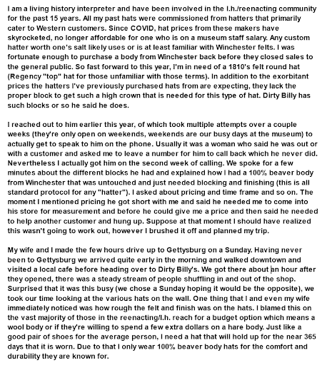 I reached out to him earlier this year, of which took multiple attempts over a couple weeks (they're only open on weekends, weekends are our busy days at the museum) to actually get to speak to him on the phone. Usually it was a woman who said he was out or with a customer and asked me to leave a number for him to call back which he never did. Nevertheless I actually got him on the second week of calling. We spoke for a few minutes about the different blocks he had and explained how I had a 100% beaver body from Winchester that was untouched and just needed blocking and finishing (this is all standard protocol for any "hatter"). I asked about pricing and time frame and so on. The moment I mentioned pricing he got short with me and said he needed me to come into his store for measurement and before he could give me a price and then said he needed to help another customer and hung up. Suppose at that moment I should have realized this wasn't going to work out, however I brushed it off and planned my trip.