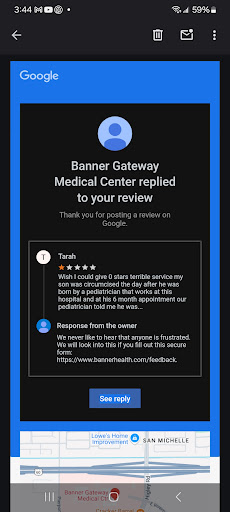 Read moreExtremally disappointed in the service, staff, customer equality of this location. I understand they are under construction and are limited on service area, but they need to point people to another hospital if they can handle the quantity of people coming in. I took my mother in because she was having trouble breathing, She has a collapsed lung and is on a air tank and was still having trouble breathing. Her blood oxygen level at home was 84 (needs to be 94 or higher to be safe) and her blood sugar levels were all over the place. From 1040 pm top 6am she sat in the waiting room, struggling to get a breath of air, they did one chest x-ray and gave her one tank of air when our tank ran out of oxygen, but even that took forever to get them to bring to her. Staff standing around talking about personal things, acting like there is not a very small waiting room filled of people. So many were crammed together. They were bringing people on stretchers to the waiting room. If you came in with a wound you were sure to leave with something else you got from someone that was right next to you, people regurgitating in the waiting room, it was a all around bad situation and I feel horrible for the people that left before being seen by a doctor due to the conditions of this emergency room. This was the worst emergency room I have seen in 40 years. The nursing staff, did say there was a long wait, but said that mom needed to see a doctor regarding her condition, but no doctor ever came to see her or check on her. At 6am, my mother had an appointment at another part of the hospital to have a catheter put in her one good lung so that we could drain her liquid from her lung, She said out of all medial procedures she has had over 70 years, this one was the worst. They barely gave her a very light sedative and it didn't do anything for her. She felt every cut they made, the tubs that they had to use for the surgery to get the catheter to the correct location, every thing they did she felt. She cried in pain and nothing was done to help her with the pain. It was horrifying, the lack of compassion & sympathy they have for their patents. One of my mother health care providers, my sister who they knew about received no information on the procedure, care of the wound and cleaning of the area. My mother who was not all there after the procedure was given a piece of paper and sent on her way. This is NOT the Banner heath care we know. This location needs so much improvement to even come near the Banner quality of care. I cant believe that this location is a banner hospital. I warn anyone that is going to this location that they need to find a different Banner in Gilbert AZ. Banner Hospital off of the 60 fwy is not a good hospital to go to when you need to have a procedure or an emergency. Management and the cooperate heads need to randomly visit this location to see the level of bad treatment, horrifying conditions, and staff care provided. This one location, had tarnished my view of Banner hospitals. They thrive to be the best, but when visiting this location, its the worst! I do NOT recommend anyone to go to this location, find another banner hospital in Gilbert and hopefully you will be treated like a person in need of care,...