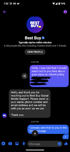 Ā Ā Ā Read moreUpdated section of review: I just updated this review to include screenshots of my conversation with Best buy at Facebook. It did not go well. I only include them because of their response to my review. They seemed like they wanted to help out. However, when I spoke with them on Facebook they had zero interest in helping in any way shape or form. Best buy is clearly not a company that stands behind its products. Best buy is clearly not a company that values its customers or their customer's time. I would also like to point out that it took over an hour for somebody on Facebook to get back to me in the first place.
