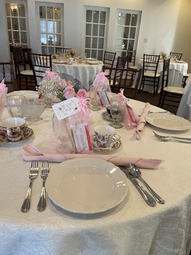 The tables were set up beautifully! We chose to have the "mismatched tea cups" instead of the white ones and every guest commented how adorable and unique they were. The waiters brought a box of assorted tea bags over for each person to choose and everyone loved it! Originally, I planned to use the silk flowers as the centerpieces for the tables, but we upgraded to fresh cut. Even the silk flowers were beautiful and elegant- Corrine has beautiful taste in every piece of decor.