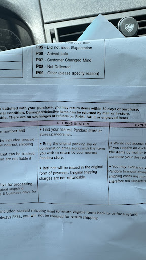 Ā Ā Ā Read moreThis morning at 10:00 AM, I went to the Pandora store, but it was closed. At 10:30 AM, I knocked on the door, and the staff rudely told me that the store opens at 11:00 AM. I mentioned that Google Maps shows the store opening at 10:00 AM, but the staff continued to be rude. I waited until 11:00 AM and entered the store, where I was met with a negative attitude. I told the staff that I wanted to return an item and exchange it for a different size. During this time, I was speaking with my friend and signed the receipt without reading it. The staff had given me a receipt for a free return and took back the bracelet that had already been paid for.